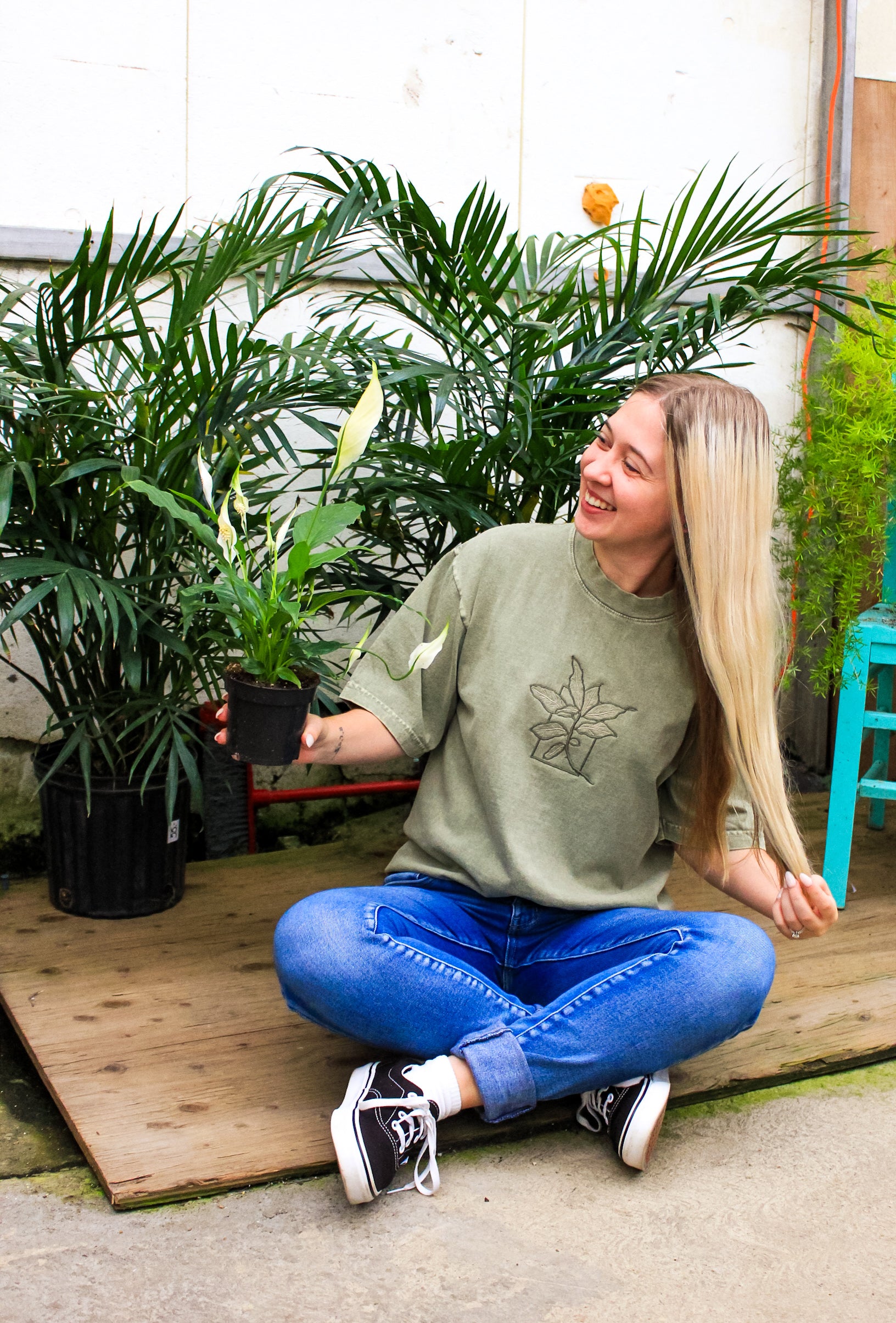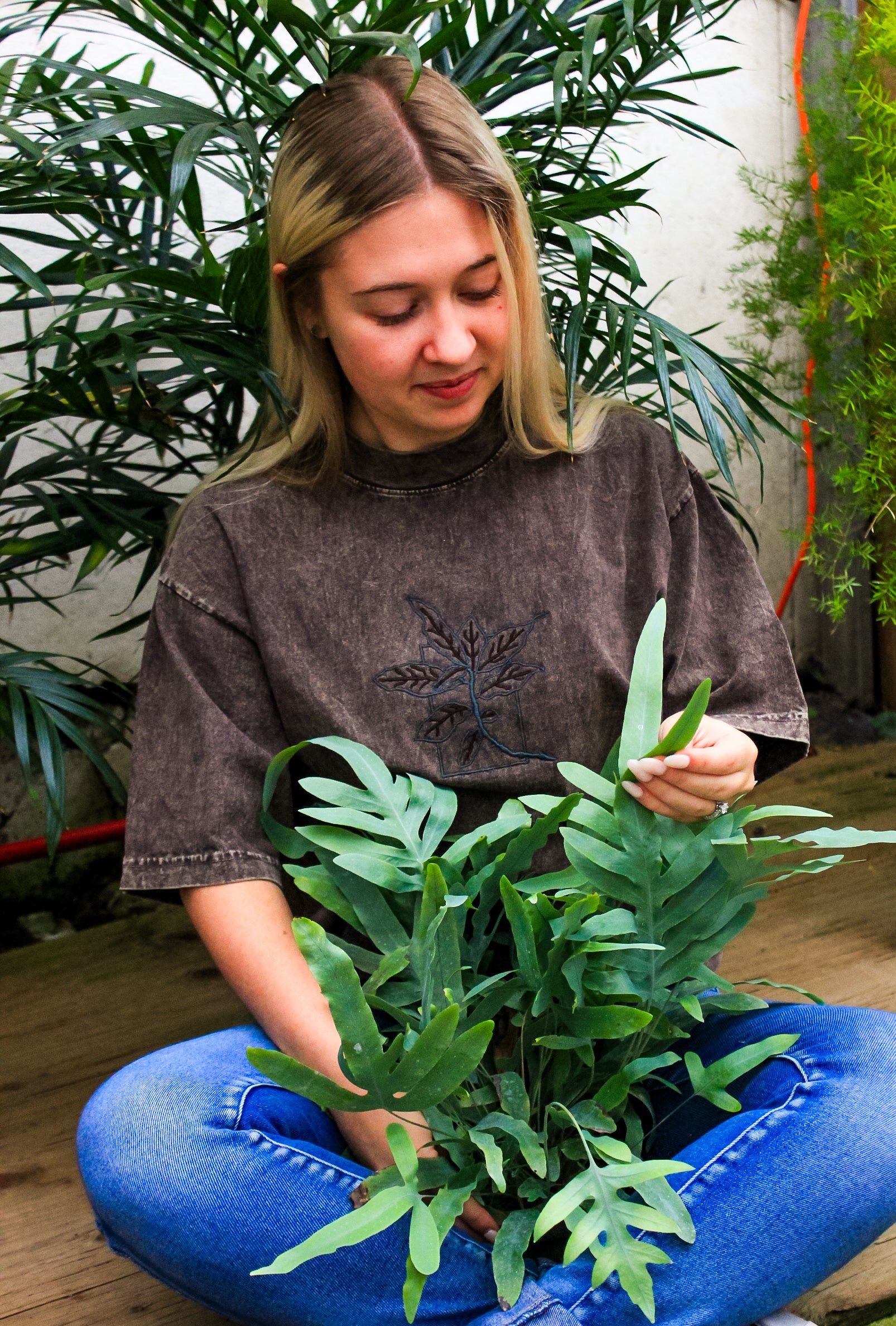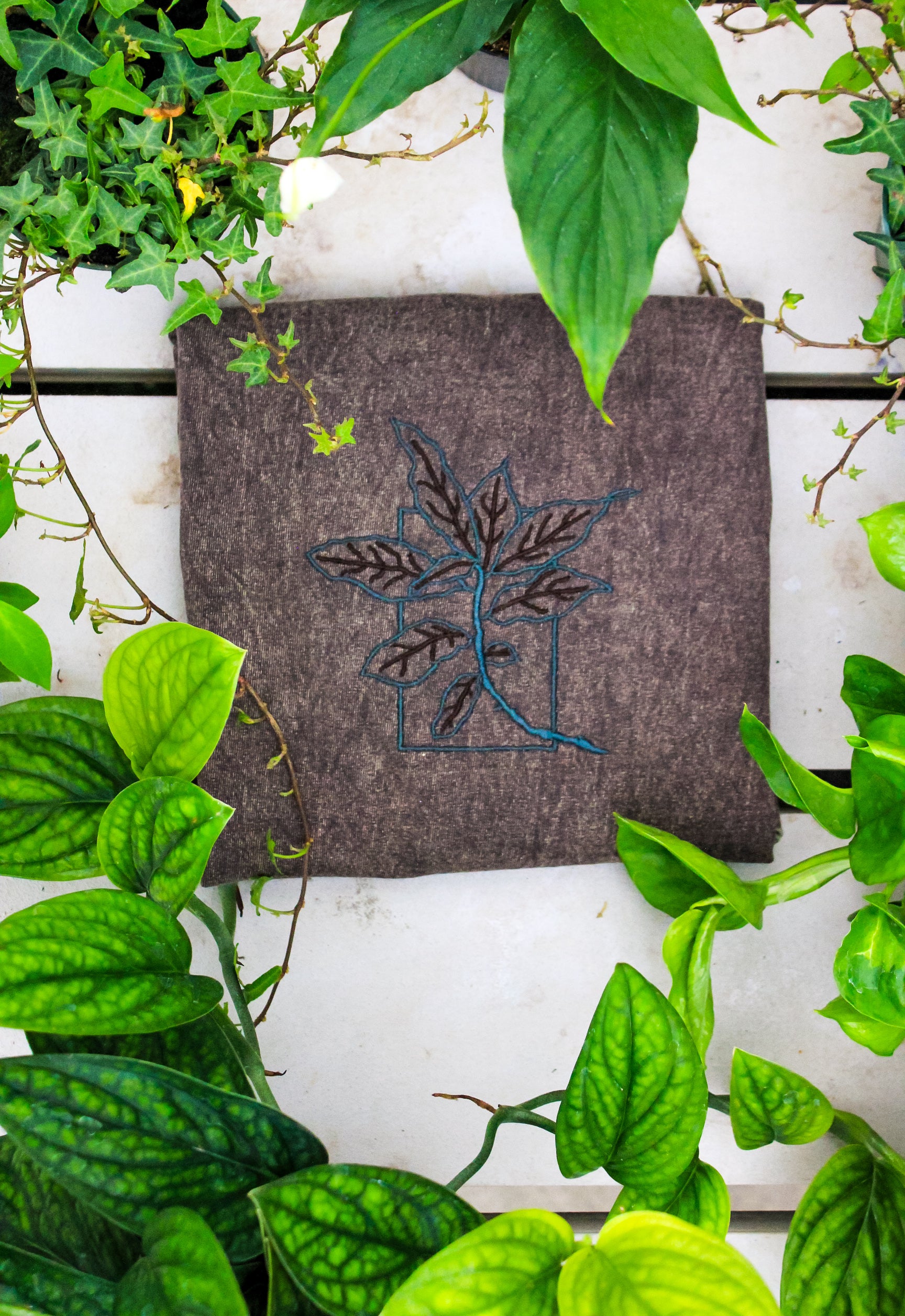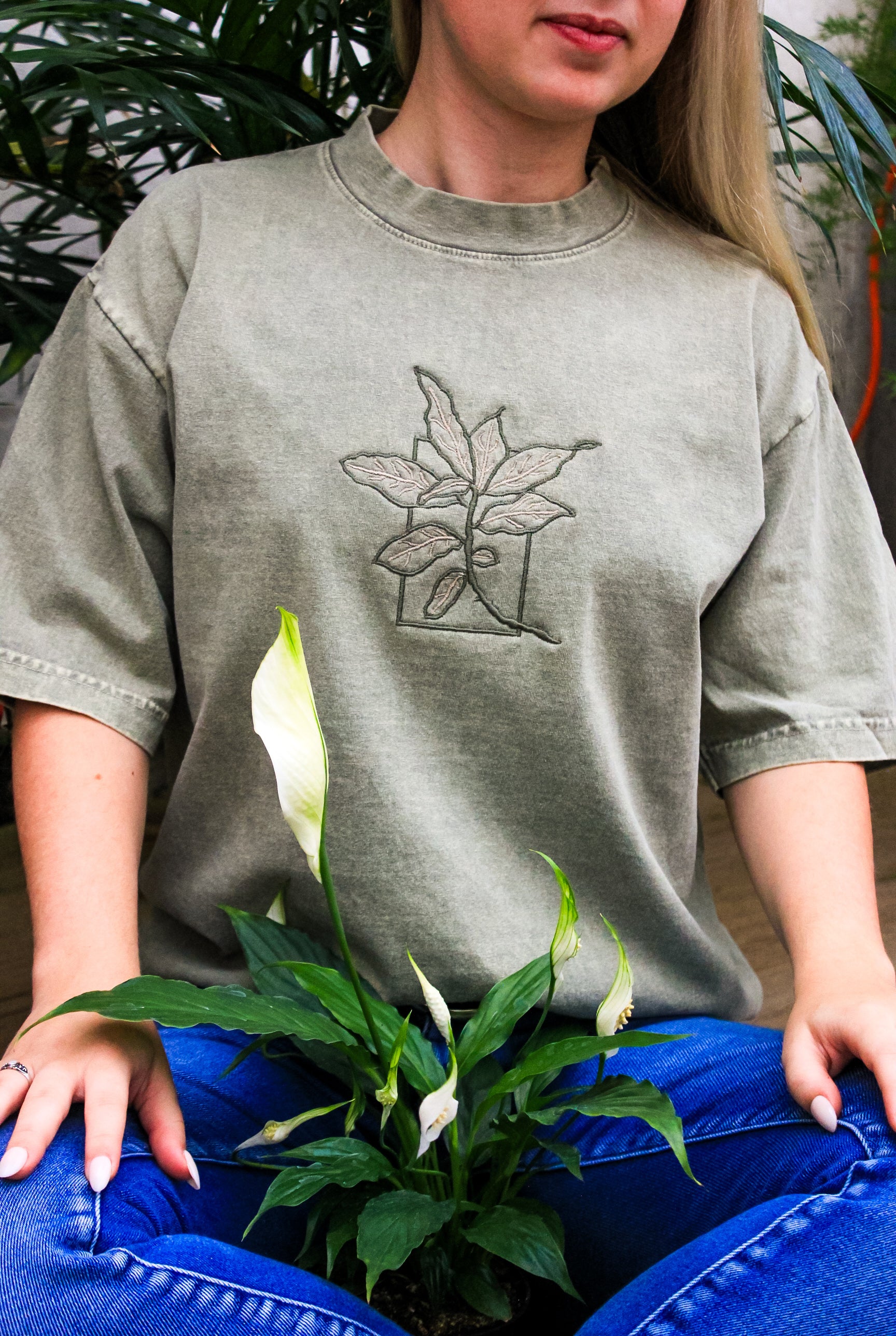 Elevate your everyday essentials with this effortlessly cool mineral wash Boxy Tee, featuring a delicately embroidered ficus plant for a subtle botanical touch. Made from soft, breathable cotton, its oversized silhouette offers a relaxed, unstructured fit that flatters all body types.